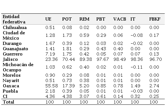 Con relación al resto de las variables, Jalisco presenta la mayor participación, seguido de Oaxaca: POT con 70.44% y 17.39%, REM con 89.38% y 5.30%, PBT con 97.67% y 0.85%, VACB con 98.49% y 0.78%, IT con 98.36% y 1.49% y, FBKF con 96.70% y 2.74%, respectivamente (Tabla 2). Es importante señalar que esta clase de actividad económica se encuentra integrada por la industria del tequila y del mezcal, por lo tanto, es mayor la preponderancia para Jalisco en las variables analizadas porque la industria del tequila es mayor y se concentra en este estado.