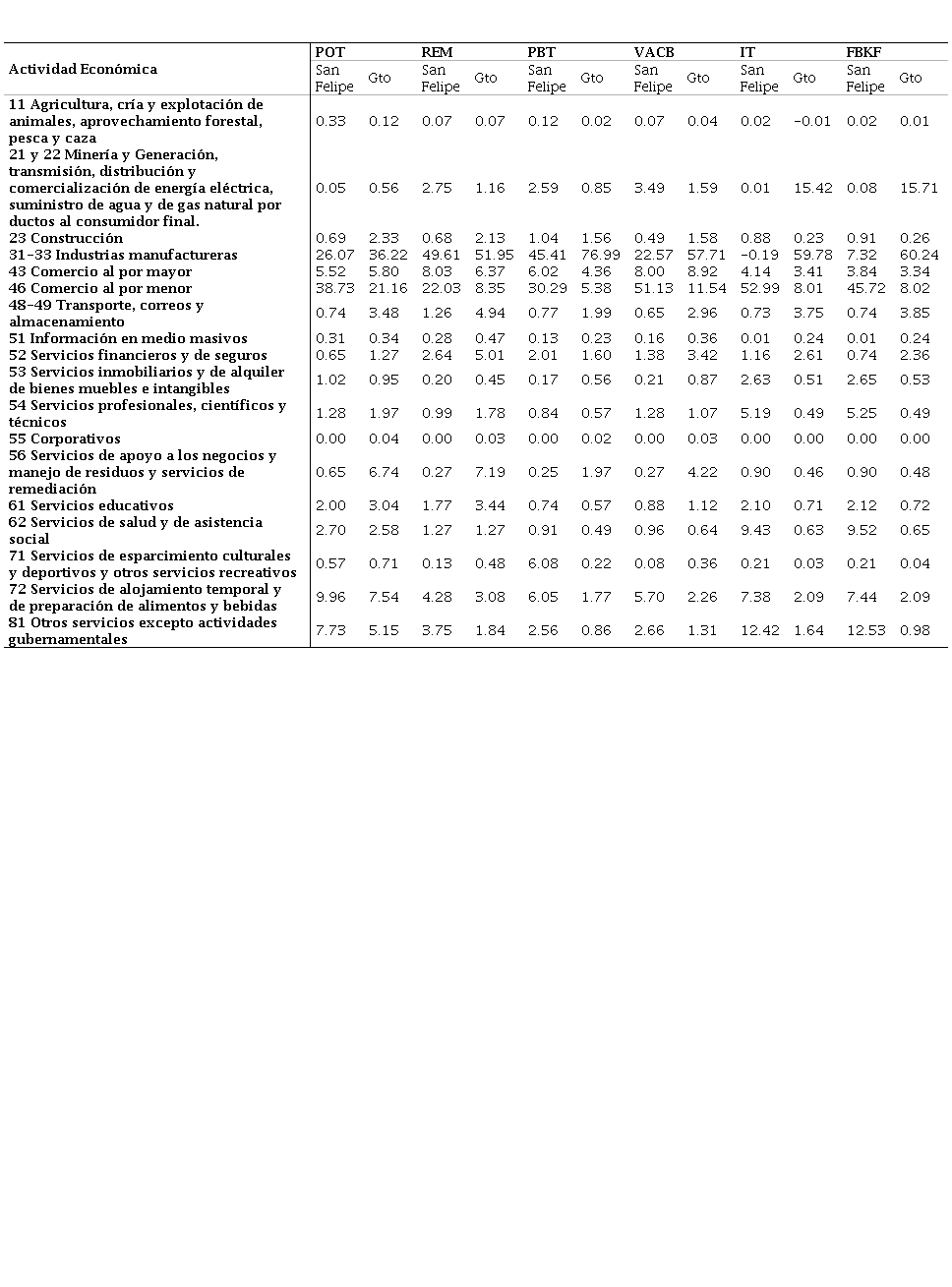 Respecto a la estructura económica, se llevó a cabo el análisis regional de las actividades económicas de San Felipe con relación al estado de Guanajuato para 2018. El comercio al por menor es el sector que genera más empleos con una participación de 38.73% y 36.22% en el POT, respectivamente. La industria manufacturera concentra las REM, tanto para San Felipe como para el estado con 49.61% y 51.95%, correspondientemente. En cuanto a la PBT figura nuevamente la industria manufacturera con la mayor aportación tanto a nivel municipal como estatal con 45.41% y 76.99%, respectivamente. En el VACB el estado presenta un 57.71% en la industria manufacturera, mientras que en San Felipe la mayor contribución se ubica en el comercio al por menor con 51.13%. Con relación a la IT, San Felipe tuvo mayor participación en el comercio al por menor con 52.99%, mientras que Guanajuato destacó con la industria manufacturera con 59.78%. Respecto a la FBKF a nivel municipal, el comercio al por menor obtuvo un 45.72% y el estado un 60.24% en la industria manufacturera (Tabla 3).