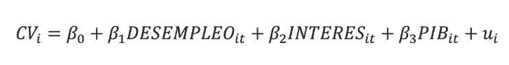 Se estudió el efecto de la actividad económica medida por el PIB, la tasa de interés y el desempleo en las carteras vencidas de los bancos mexicanos. Estas variables han sido señaladas en la literatura como las principales métricas macroeconómicas que influyen en el índice de morosidad de los bancos, en estudios como los de Nkusu (2011), Luna (2013), Ghosh (2015), Rehman (2017), Kjosevski y Petkovski (2017), Kil y cols. (2020) y Nor y cols. (2021), entre otros. El análisis se efectuó mediante una regresión múltiple por mínimos cuadrados. Véase ecuación 1.