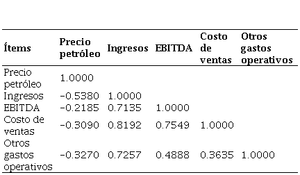 En la Tabla 7 se muestra la relación de las variables financieras del sector y el precio del petróleo, la cual es media negativa con los ingresos y resulta consistente con lo mencionado en la literatura previa, donde un aumento del precio del petróleo genera inflación y, en consecuencia, aumenten los costos de viaje (Agiomirgianakis y cols., 2015; Muhammand y cols., 2018), el costo de los bienes y servicios (Anoruo y Elike, 2009), y disminuya la demanda turística (Yeoman y cols., 2007; OMT, 2020). Lo anterior, repercute directamente en el ingreso de las empresas del sector turístico. Las otras variables muestran relaciones negativas, aunque débiles. Asimismo, dan un indicio del impacto negativo del alza del precio del petróleo en las variables financieras del sector.