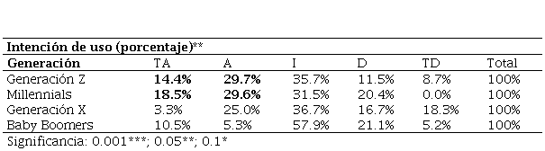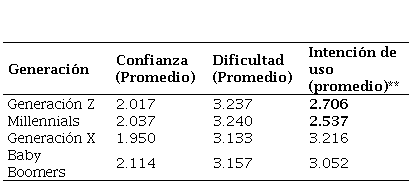 En la tabla 2 se puede apreciar que la edad no demostró tener ningún impacto en la confianza en el uso de la plataforma de pagos electrónicos móviles ni en la percepción de dificultad en su operación, lo que indica que todos los grupos percibieron de manera similar ambos constructos. Sin embargo, la intención de uso sí fue significativamente mayor (. < 0.05) en los grupos más jóvenes representados por los Millennials y la Generación Z. Asimismo, en las pruebas de Chi Cuadrada solo resultó significativo el efecto de las generaciones sobre la intención de uso (. < 0.05) como se muestra en la tabla 3.