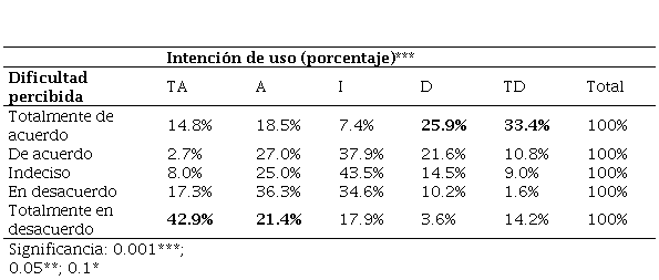 La tabla 4 muestra los porcentajes de usuarios que están dispuestos a usar CoDi en base a la percepción de dificultad en su uso. Los resultados muestran que a medida que se incrementa la dificultad percibida baja la intención de uso de la plataforma (. < 0.001). Este resultado comprueba la hipótesis 4. Y viceversa, entre aquellos que no perciben dificultad la intención de uso de CoDi es mayor.