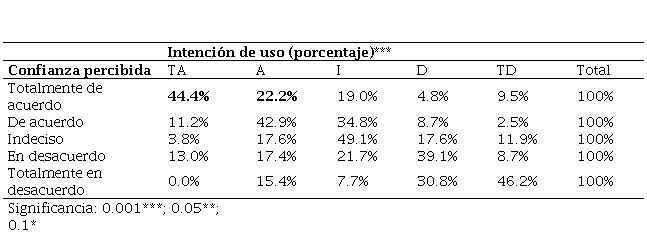 En el análisis de regresión lineal se corrobora que tanto la confianza (p <0.000. como la dificultad de uso percibida (p < 0.004. son significativas. La primera afecta de manera positiva la intención de uso de los pagos electrónicos, mientras que la segunda disminuye dicha intención.