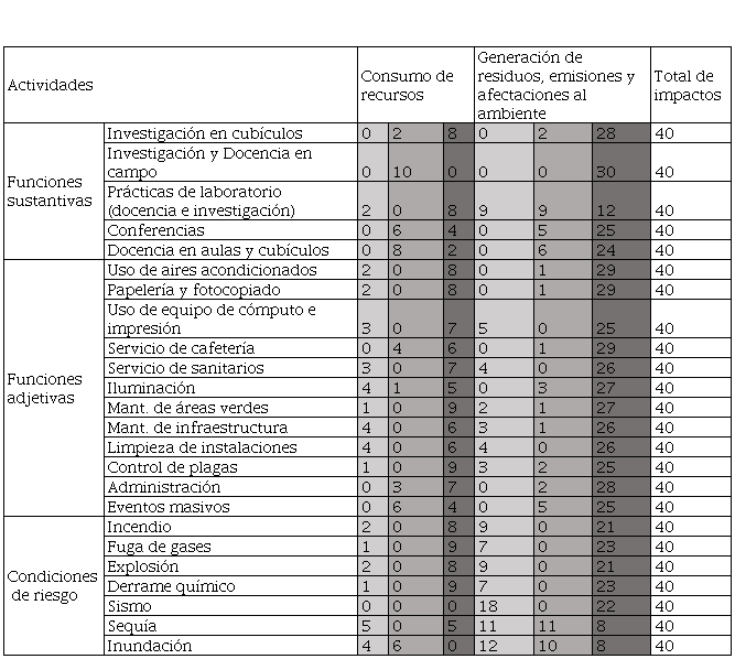 Con el objeto de documentar los temas que necesitan atención dentro de las esferas ambientales, se realizó una Matriz de Identificación y Evaluación de Aspectos, Impactos y Riesgos Ambientales. Lo anterior, se representa por una matriz binaria que contiene las esferas ambientales que sufren los impactos por procesos antrópicos en las columnas y de manera vertical las actividades propias de la organización. La evaluación representa 25 actividades entre funciones sustantivas, adjetivas y de riesgo (Ver Tabla 1).