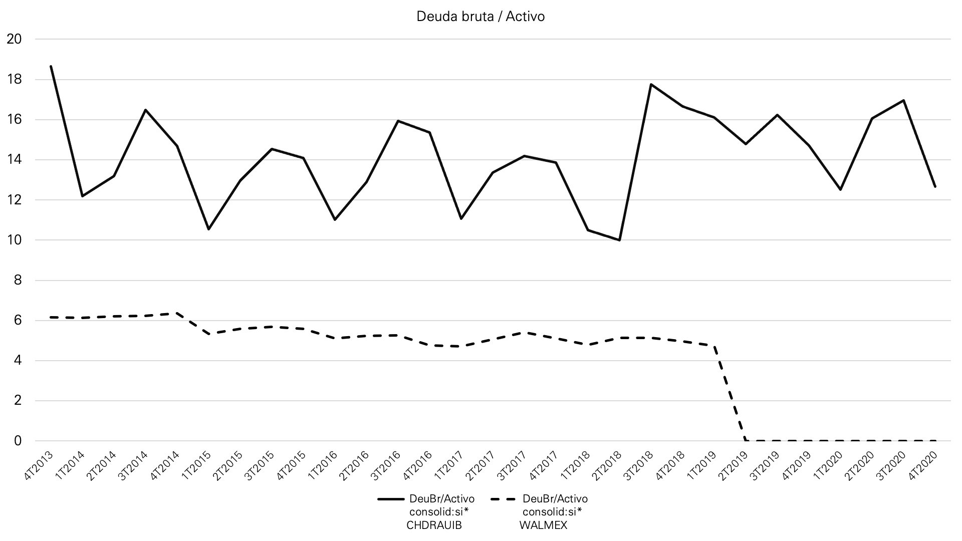 Los precios por acción sugieren que la empresa Chedraui muestra una mayor volatilidad, sobre todo a partir de la crisis generada en el mercado en marzo de 2021. Por otro lado, se observa en la Figura 6 que Walmart mantiene una mayor estabilidad con bajo nivel de endeudamiento financiero, el cual es nulo a partir del año 2019.