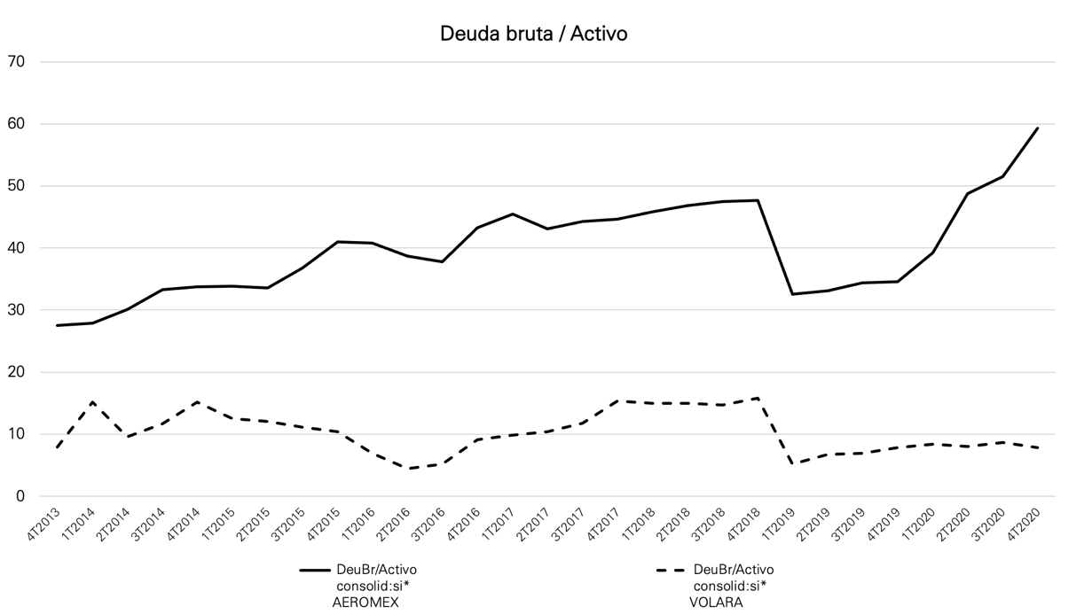 Los resultados de la correlación entre la razón de deuda total y el precio por acción fueron negativas en todos los sectores analizados. En relación con las correlaciones negativas, la Tabla 1 muestra que las aerolíneas representadas por Aeroméxico y Volaris tienen el menor grado de correlación. Este resultado sugiere que la deuda tiene un menor impacto negativo con respecto al precio de las acciones, es decir, se refleja en el riesgo de la acción, pero en menor medida de la plusvalía o minusvalía que el precio de la acción, por lo que la plusvalía no depende en gran medida de la deuda. Como se observa en la Figura 1, Aeroméxico financiaba con un mayor nivel de deuda la inversión en activos durante el periodo analizado; aunque, ambos disminuyeron su nivel de endeudamiento a mediados del 2019, la empresa Volaris mantiene estable su nivel hasta el año 2020, mientras que Aeroméxico incrementó su endeudamiento hasta alcanzar su máximo a inicios del año 2021. Siguiendo a Reinhart y Rogoff (2011), la empresa con mayor endeudamiento acumuló un mayor nivel en el periodo de crisis iniciado en el año 2020, generando un círculo vicioso dado que, ante la falta de ingreso y liquidez, así como sus costos y gastos fijos, hizo necesario más endeudamiento.