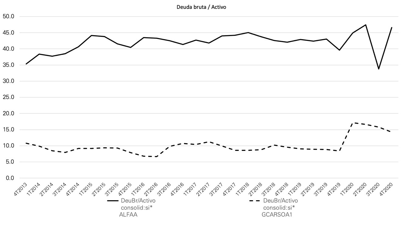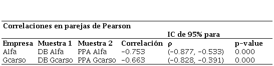 La Figura 3 muestra tanto la diferencia entre el nivel de endeudamiento de ambas empresas, como el aumento del nivel de endeudamiento durante el primer trimestre de 2020. Así, para Alfa, la empresa con mayor deuda, se observa una mayor variación o inestabilidad en su nivel de deuda, incrementándose a aproximadamente un 50%, mientras que, en la mayor parte del periodo de interés, se había mantenido cerca de un nivel de 40%. Para el caso de la empresa GCarso, en el año 2020 aumento su nivel de endeudamiento a casi 20%, después de mantener dicho nivel en alrededor del 10%, aunque la tendencia en ese año es a disminuir el nivel hacia un valor cercano al 10%, es decir, regresar a su nivel habitual de endeudamiento.