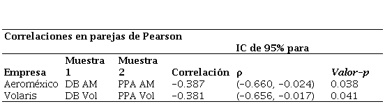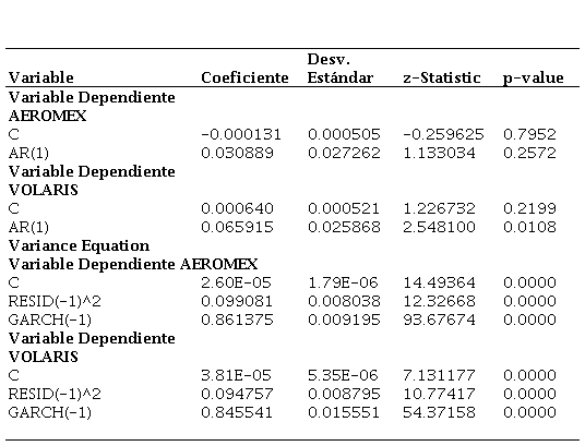 , se observa en la Tabla 2 como la volatilidad tiene mayor memoria en Aeroméxico. Por lo tanto, de forma general, Aeroméxico es más riesgosa que Volaris. En ese sentido, los resultados siguen a Alfaro y cols. (2019), quienes sugieren más riesgo en las empresas endeudadas, sobre todo después de las crisis financieras.