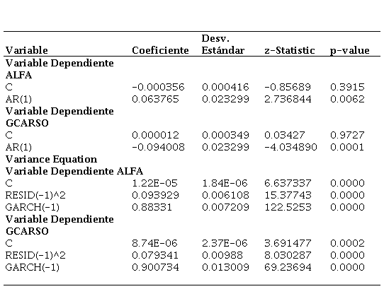Resultados: Los resultados sugieren que el endeudamiento se comporta de manera inversa con el precio por acción y la volatilidad es más persistente si se tiene un mayor apalancamiento.