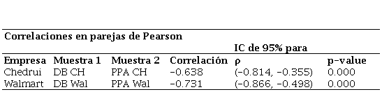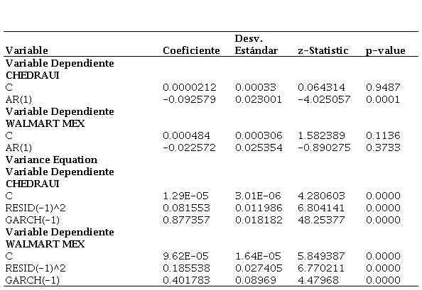 Al comparar los coeficientes del modelo GARCH, la Tabla 6 muestra que la empresa Chedraui tiene persistencia de volatilidad mientras que Walmart no. Por los bajos coeficientes, Walmart muestra la menor persistencia de volatilidad de todas las empresas. Comparando por sectores, se observa que un mayor impacto en la crisis tiene relación con una mayor volatilidad, pero, una mayor persistencia de esta última en empresas con mayor endeudamiento.