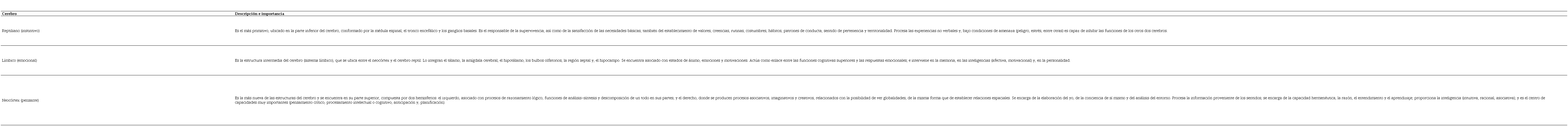 Una de las formas más populares para abordar su estudio es medio de la Teoría del Cerebro Triuno, que según Tarantino (2018) y Vallejo y Sanandrés (2016), se debe al médico y neurocientífico Paul D. MacLean, quien a partir de trabajos realizados durante la década de los 70 del siglo pasado propuso, para su mejor comprensión, la división del cerebro en tres: reptiliano, límbico y neocórtex, cada uno de los cuales tiene sus propias funciones y, a su vez, una estructura físico-química diferente desarrollada a partir del proceso evolutivo, tal como puede apreciarse en la tabla 1.
