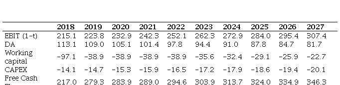 A discounted cash flow model must consider the number of projection years that are being taken. For this valuation, a projection was made from 2018 to 2023. The assumptions were presented according to the information of the industry and the important facts, the discounted flow was made up to EBIT, thus using depreciation and amortization (DA), working capital, CAPEX, and the income tax rate itself. The discounted cash flow calculation was performed as follows: