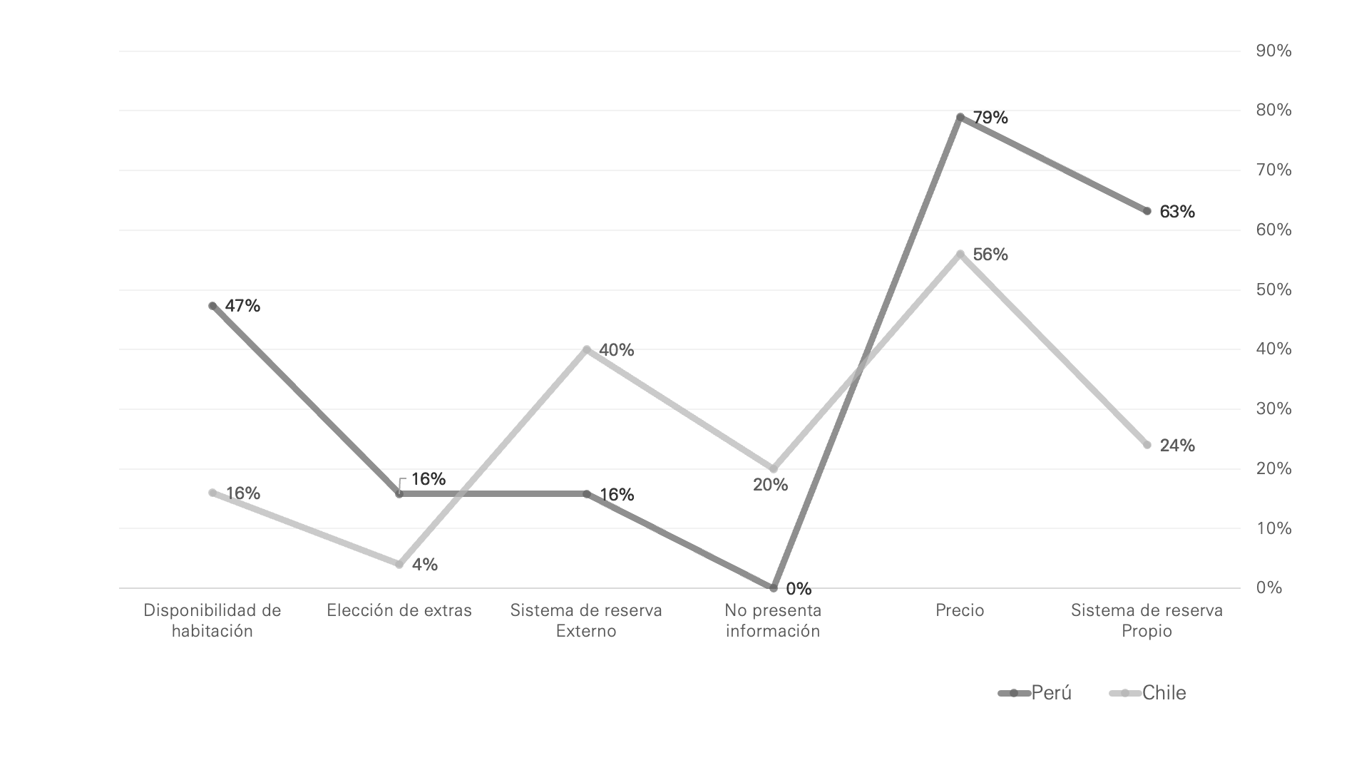 Resultados: Gran parte de indicadores relacionados con el proceso de reservas es favorable a la hotelería peruana, identificándose una superioridad mayor a un 30% con respecto a los hoteles chilenos. No así en el resto de indicadores.