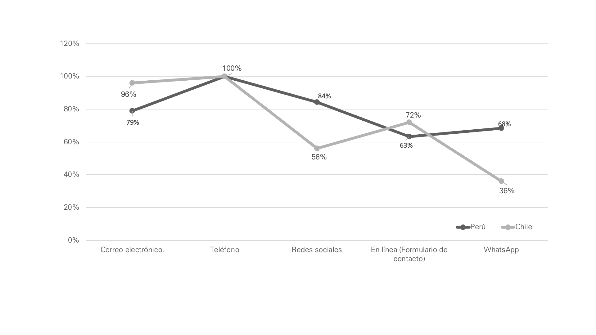 Aunque la adopción de herramientas digitales es muy similar en ambos países, se observa que los sitios peruanos se encuentran situados dentro de un rango de un 10% por sobre los sitios web de hoteles chilenos. Solamente las empresas hoteleras chilenas destacan en que presentan un número de usuarios de redes sociales levemente superior a los hoteles peruanos. Además, existe una leve ventaja por parte de los sitios peruanos en todas las dimensiones.