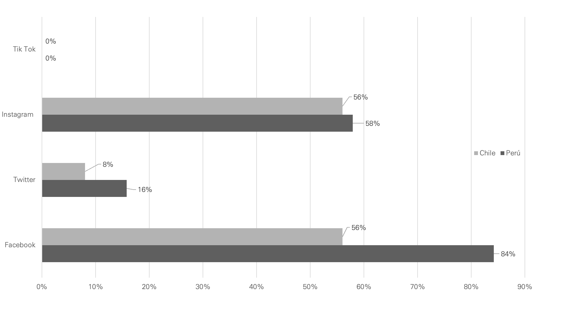Comparativamente, la utilización de las principales redes sociales utilizadas por el rubro hotelero en Chile y Perú: Instagram y Facebook, es levemente mayor en Perú. También se evidencia una ventaja en el uso de Twitter por parte de este país (Figura 3).
