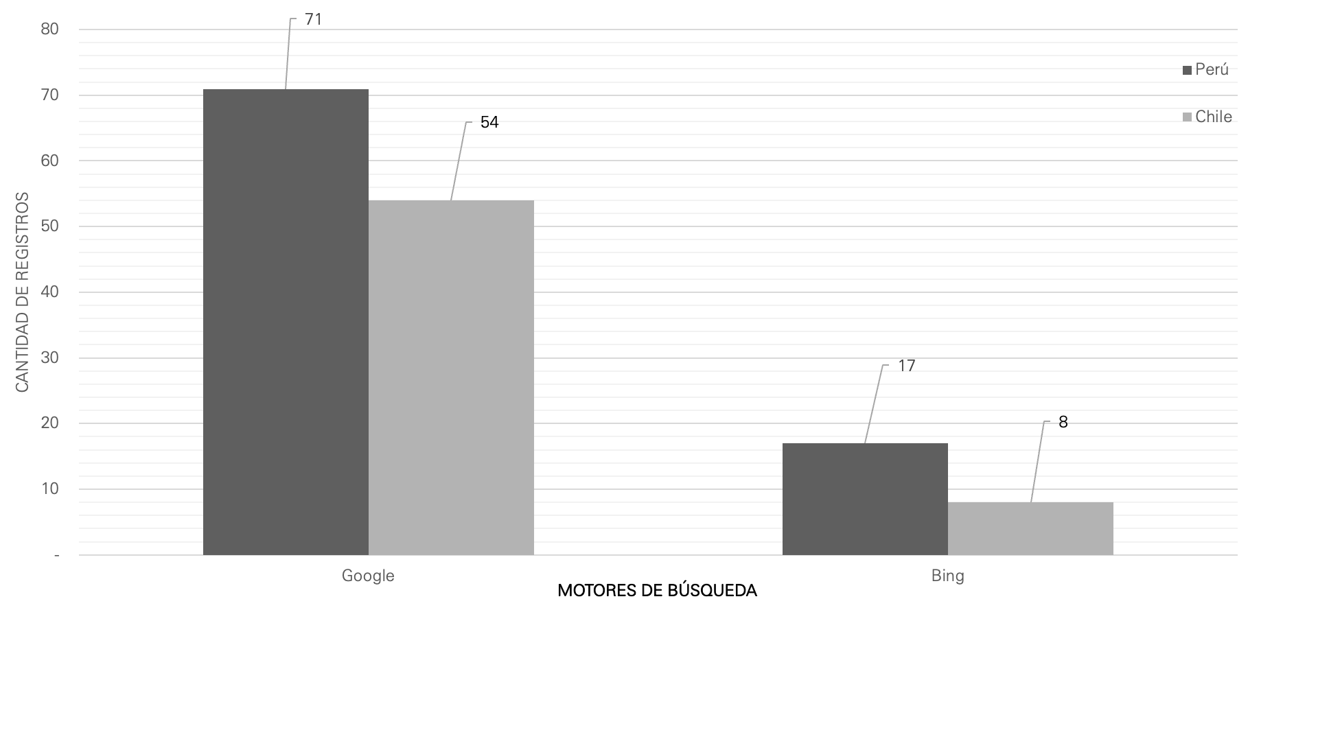 Comparativamente, se presenta un sector hotelero chileno más activo en cuanto a la cantidad de interacciones que lo analizado en Perú. Se aprecia además que los hoteles de ambos países centran sus esfuerzos en el uso de Facebook como red social dominante (Figura 4). En cuanto al nivel de indexación de los sitios web de hoteles, tanto de Chile como de Perú, se aprecia que el nivel de los sitios es bastante superior en los hoteles peruanos, lo que conlleva a una mayor posibilidad de recibir visitas al sitio web, porque estos están más expuestos en los buscadores de referencia (Figura 5).