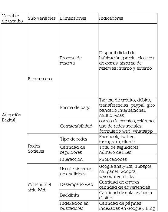Con el objeto de recopilar y describir la situación de adopción digital de los hoteles antes indicados, se determinó su operacionalización según la definición nominal, definición real y definición operacional de la variable de estudio. Lo anterior implica una partición en términos de sub variables, dimensiones e indicadores específicos, lo cual se muestra en la Tabla 1.
