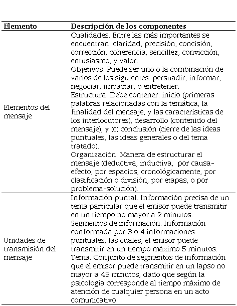 a) La comunicación verbal. De acuerdo con Sosa (2009) y Villafuerte (2012), es un tipo de comunicación en la que el emisor expresa (con sus palabras) información, datos, ideas, sentimientos, pensamientos, emociones, creencias, necesidades, deseos, opiniones, actitudes y experiencias mediante debates, presentaciones, entrevistas, reuniones o conversaciones. Depende de dos subelementos claves (que se detallan en la tabla 4), a saber: