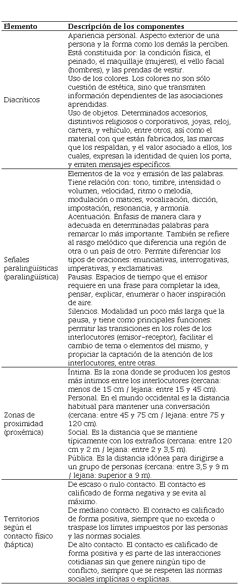 b) La comunicación no verbal. Según Rulicki y Cherny (2007), se refiere al conjunto de elementos que estimulan emociones, sentimientos y estados de ánimo a través de gestos, posturas, miradas, variaciones de la voz y otros signos o señales no verbales; por lo tanto, constituye un complemento de las palabras. Carnegie (2003), Navarro (2013), Fast (2005), López y cols. (2016), Palomares (2011), Pease y Pease (2010), Sosa (2009) y Villafuerte (2012), señalan que está conformada por las seis disciplinas (cuyos elementos se detallan en la tabla 3) que se describen a continuación: