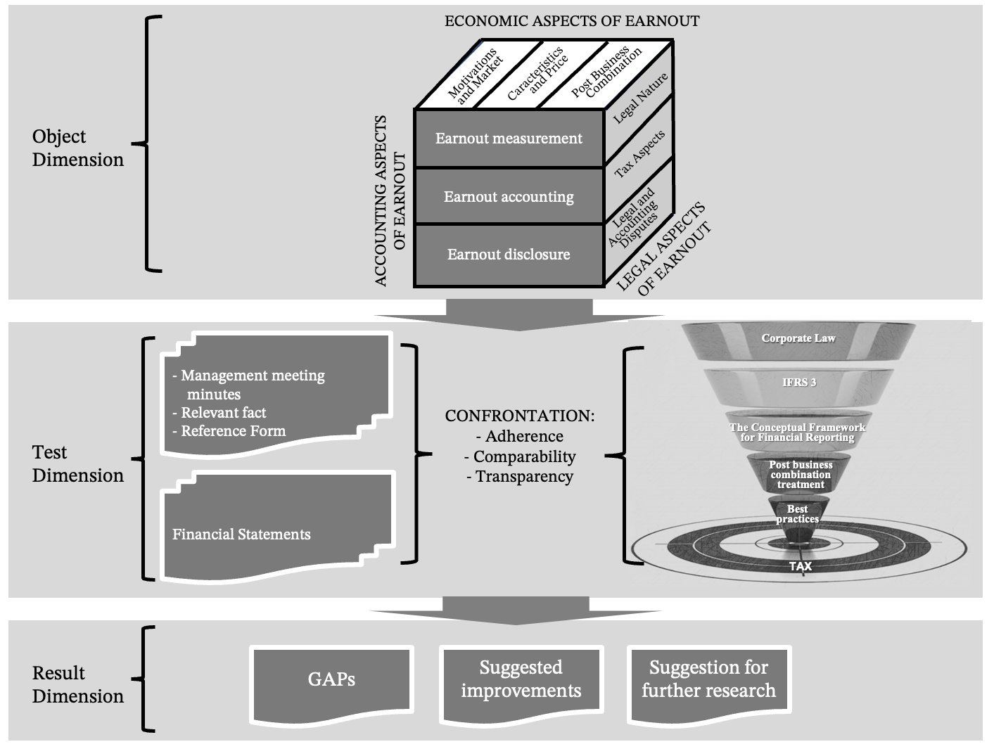 · Object Dimension –in a three-dimensional perspective, aimed to identify and relate: the economic aspects of earnouts: motivation and market; features and price; and economic treatment after the business combination; the legal aspects of earnouts: its legal nature and legal-accounting controversies regarding the non-concurrent principles and rules on the earnout theme; and the accounting aspects of earnouts, regarding its measurement, accounting, and disclosure. The economic dimension (business objectives of earnout and impacts related to valuation), accounting dimension (contingent consideration, accounting choices, compliance with accounting pronouncements, recognition of assets or liabilities), and legal dimension (qualification of the operation under the legislation and the form of contractual structuring) are detailed in Chapter II – Theoretical foundation of this article,