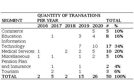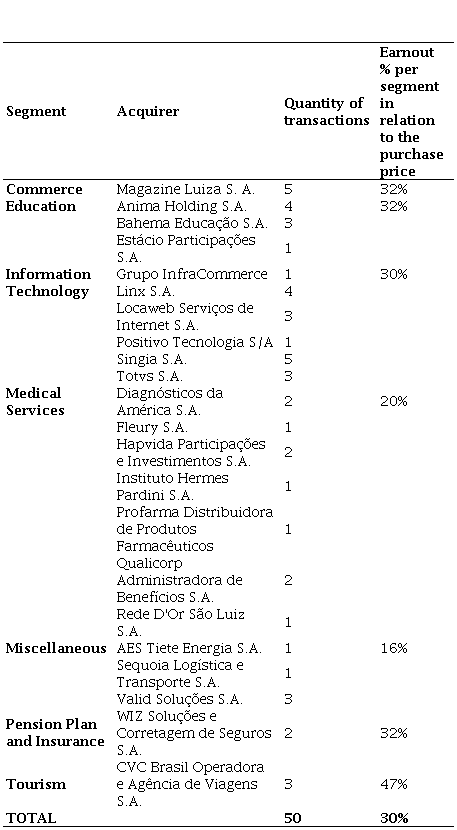 Another aspect analyzed is the concentration of transactions in specific companies. Table 1 shows that transactions are concentrated only in a few companies in the Educational Service and Information Technology sectors, while in the Healthcare sector acquisitions are more dispersed. An important point that stands out in Table 2 is that only one company in the Commerce sector made acquisitions using earnouts, apparently because the acquired companies are not part of the acquirer's traditional line of business, justified by the expansion strategy of the business to other segments of the economy, which is also one of the expected factors for the use of the contingent price (Datar et al., 2001).