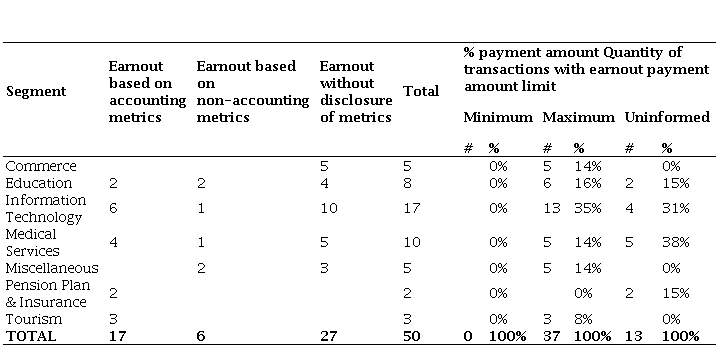 Despite this, there are some limitations in this work that may hinder the generalization of the results: i) the transactions analyzed were limited to the Brazilian markets environment. A wider range of deals involving earnout feature from other geographies, could enhance the basket of observations and influence our conclusions; ii) the use of disclosed financial statements and publicly available information only, limited our analysis to those transactions carried out by publicly traded companies following disclosure standards. Private equity deals were therefore not necessarily identified and included in the analysis and iii) the study was fully based on information that was publicly available which, in some cases, could not be fully tracked and reconciled generating some misalignment data, as pointed out on table 5. Also, the analysis of the financial statements was based on content analysis of the financial statements, which brings with it a certain degree of subjectivity in the interpretation and collection of data.