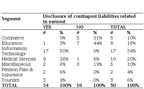 However, in qualitative terms, as shown in the upper part of Table 3, most companies do not disclose their earnout measurement basis. This omission significantly impairs the usefulness of accounting information for this type of transaction, since the users cannot ascertain how earnouts will be assessed in the future, nor can they foresee the potential impact on the acquirer's results in the upcoming years. This situation is more critical in the disclosures of companies in the Information Technology sector, where 10 out of 17 transactions, did not disclose the earnout measurement basis, which is highly incompatible with the intangibility of the results of companies in this sector.