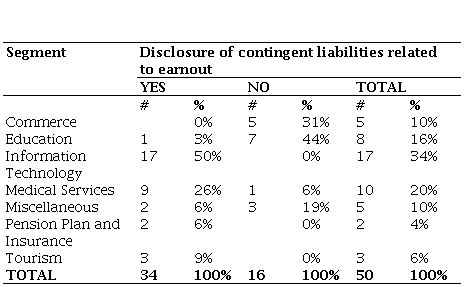 Another finding pertains to disclosure of liabilities associated with acquisitions (not only those related to earnouts). Table 4 shows that most companies disclosed these obligations. It is a positive sign that users of accounting information can monitor the movement of values in the following years. However, the format and depth of this information are not homogeneous, and, in some cases, it is only possible to identify total amounts, but not by type of obligation (that is, by type of acquisition liability).