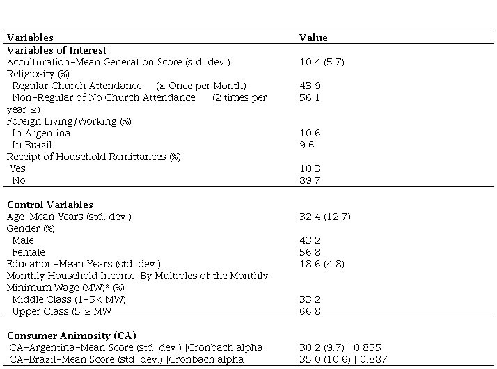 Our research seeks in part to replicate and extend the consumer animosity construct into two new country pairs in South America, offer novel antecedents for consumer animosity, and model these elements into consumers’ willingness to buy specific foreign-origin products. We are the first to focus on Paraguayan consumer animosity vis-à-vis Argentina and Brazil, replicating the applicability of consumer animosity in these bilateral environments. Novel antecedents of acculturation, religiosity, lived and worked time in the target foreign country, and the receipt of household remittances are tested as an extension of the literature on consumer animosity.
