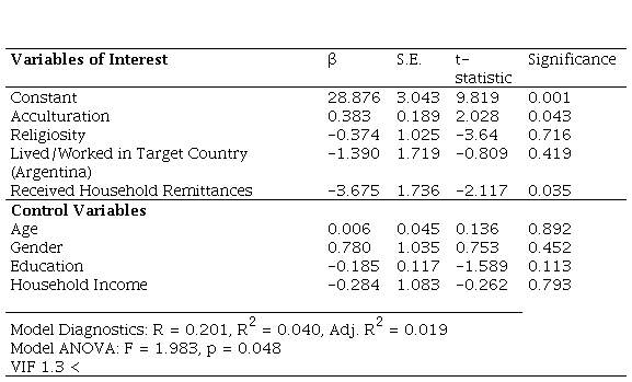 The results of the multiple regression model estimation for consumer animosity and Argentina are reported in Table 2. Two predictor variables are significant, acculturation and received household remittances. A one-point increase in the generation score for respondents, the proxy for acculturation, results in a 0.383 point increase in the CA score supporting H1a1. The results for respondents in households that receive remittances realize a reduction in CA by 3.675 points. Thus, H1d1 is supported. The results for religiosity and having lived and worked in Argentina are not significant, and thus do not support H1b1a or H1b2a, nor H1c1. The model diagnostics are within acceptable ranges and appear at the bottom of Table 2. A low VIF and a correlation matrix for the variables is included in Appendix B and indicate no concerns with multicollinearity.