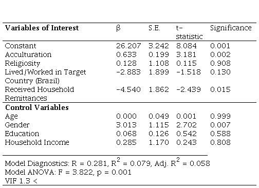 The multivariate statistical procedure undertaken in our analyses is multiple regression. Multiple regression is a robust multivariate statistical tool to discern the relationship between a dependent variable and a set of independent or predictor variables (Hair et al., 1995). In the present study, multiple regression is an appropriate research method as we seek to determine the relationship through an explanatory chain model or conceptual model between a set of novel independent variables—acculturation, religiosity, lived/worked in target country, and the receipt of household remittances—with the dependent variable, the consumer animosity scale (see Figure 1). Because consumer animosity has been researched in several binational contexts over two decades, we also include a set of control variables (age, gender, education, income) that are present in many previous studies of consumer animosity.