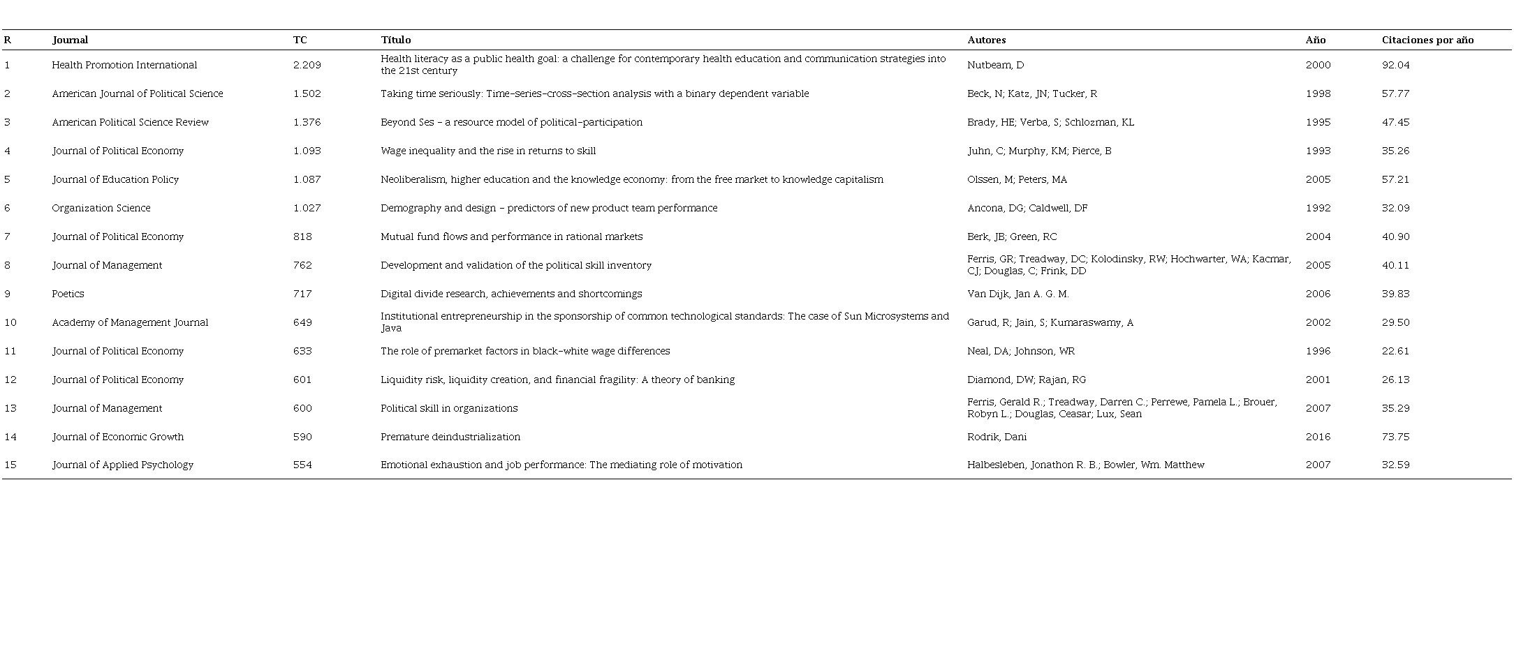 Considerando los Top 15 artículos más influyentes de la habilidad política sobre el total de las 6.782 publicaciones del tópico, aparecen cinco artículos que emplean la habilidad política para evaluar desde una perspectiva holística y abarcativa el desempeño de los mercados financieros y su impacto en la liquidez bancaria y los salarios de la economía. Por su parte, existen también cinco artículos que se enfocan específicamente en la perspectiva de desempeño psicológico de la habilidad política para promover comportamientos favorables para el desempeño individual y de equipos en las organizaciones.