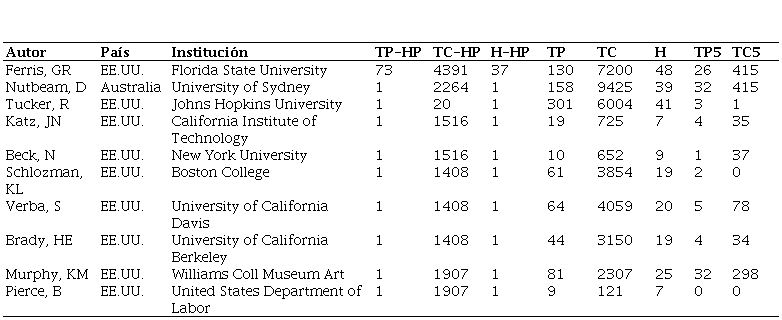 Al evaluar 48 años de producción académica y científica de la habilidad política, es importante destacar los autores que han tenido mayor presencia e influencia en el tema. Para ello, se presentan los Top 10 autores más importantes en términos de su productividad y citaciones. No se presenta un cuadro mayor de autores debido a que existen resultados muy atomizados y, además, al ser un tema de incipiente desarrollo y expansión, no existe una amplia producción científica en este tema a la fecha del presente artículo. Cabe subrayar la importancia de Gerald R. Ferris, profesor de administración y psicología de la Florida State University, quien ha desarrollado una robusta carrera profesional en el campo de la investigación de la habilidad política. Desde su artículo “Development and validation of the political skill inventory” en 2005, se ha convertido en el investigador más influyente en el campo de la habilidad política, desde la articulación de su constitución como constructo psicológico hasta su aplicación en distintas disciplinas del ámbito de la administración, tales como el desempeño organizacional, el desarrollo de carrera, la responsabilidad organizacional y la reputación corporativa, entre otros aspectos.