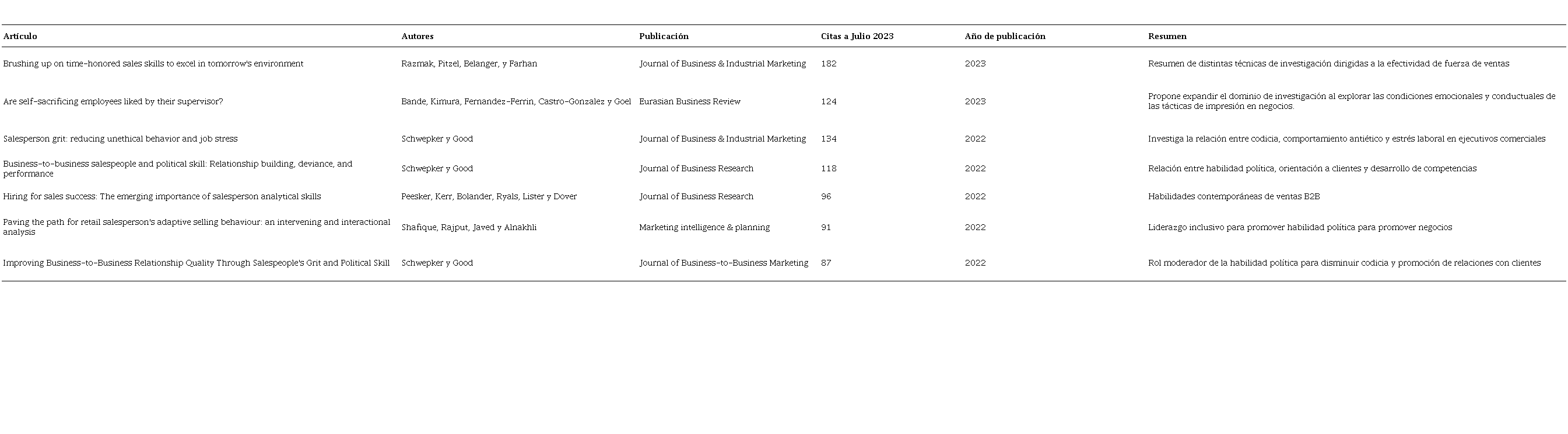 Finalmente, los cinco artículos restantes presentes en este ranking comparten una visión centrada en investigar la importancia de la habilidad política para generar redes organizacionales para el entendimiento y comprensión formativa de las dinámicas de la economía industrial y los modelos económicos y tecnológicos contemporáneos. El detalle de estos artículos se presenta en la Tabla 4.