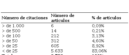 Como se observa en la tabla anterior, solo el 8,03 % de los artículos ha recibido más de 50 citaciones y solo 232 han recibido más de 100 citaciones, correspondiente a un 3,43 %.