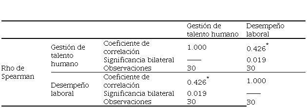 Resultados: De acuerdo con las variables gestión del talento humano y desempeño laboral según los colaboradores, existe una aceptable relación pues a mejor gestión del talento humano mejora el desempeño laboral, concluyendo que existe una correlación lineal positiva media (Rho de Spearman: 0.426). Las medias, según la percepción de los trabajadores, hacen referencia a la selección del personal y capacitación laboral como esenciales para lograr un mejor rendimiento y alcanzar los objetivos de manera eficiente como efectiva.