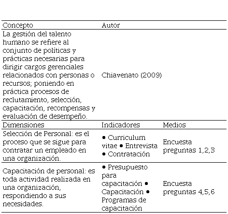 En las siguientes tablas se presenta cómo se derivan las variables. En la Tabla 1 se muestra la variable de gestión del talento humano, y en la Tabla 2 el desempeño laboral. Se muestra el instrumento de medición y sus respectivos números de reactivos están comprendidos de acuerdo con cada dimensión. Asimismo, se muestra la clasificación que se le dio a cada variable para su estudio y la correlación de estas.