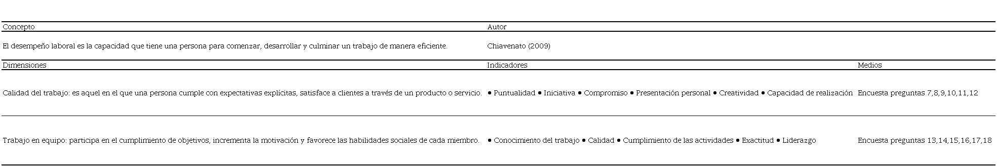 Con relación a la conceptualización de desempeño laboral, Chiavenato (2009) explica que este corresponde a la capacidad que tiene una persona para comenzar, desarrollar y culminar un trabajo de manera eficiente, con calidad y buen liderazgo, para así lograr positivamente los objetivos trazados. El trabajador desempeña su trabajo poniendo en acción las competencias en las que se distinguen: habilidades duras como habilidades blandas en contraste a las expectativas de la institución. De acuerdo con lo que explica Chiavenato (2009), las tareas que realiza el trabajador es lo que realmente define su desempeño y comportamiento, los cuales se podrán evaluar de manera positiva o negativa con el fin de saber si el trabajador está siendo efectivo dentro de la organización. Por consiguiente, el resultado reflejará el estado de desempeño del individuo y el impacto que tendrá sobre el logro de las metas organizacionales.