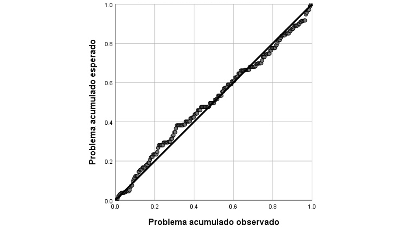 El primer supuesto a cumplir es el de independencia, en el cual, Landero y González (2012) señalan que para aceptar este supuesto, el estadístico Durbin-Watson que mide el grado de autocorrelación entre el residuo correspondiente a cada observación y la anterior, se debe encontrar entre 1.5 y 2.5, en este sentido, al procesar los datos para obtener el modelo, este estadístico arrojó como resultado 1.543, por lo tanto, cumple con el supuesto.