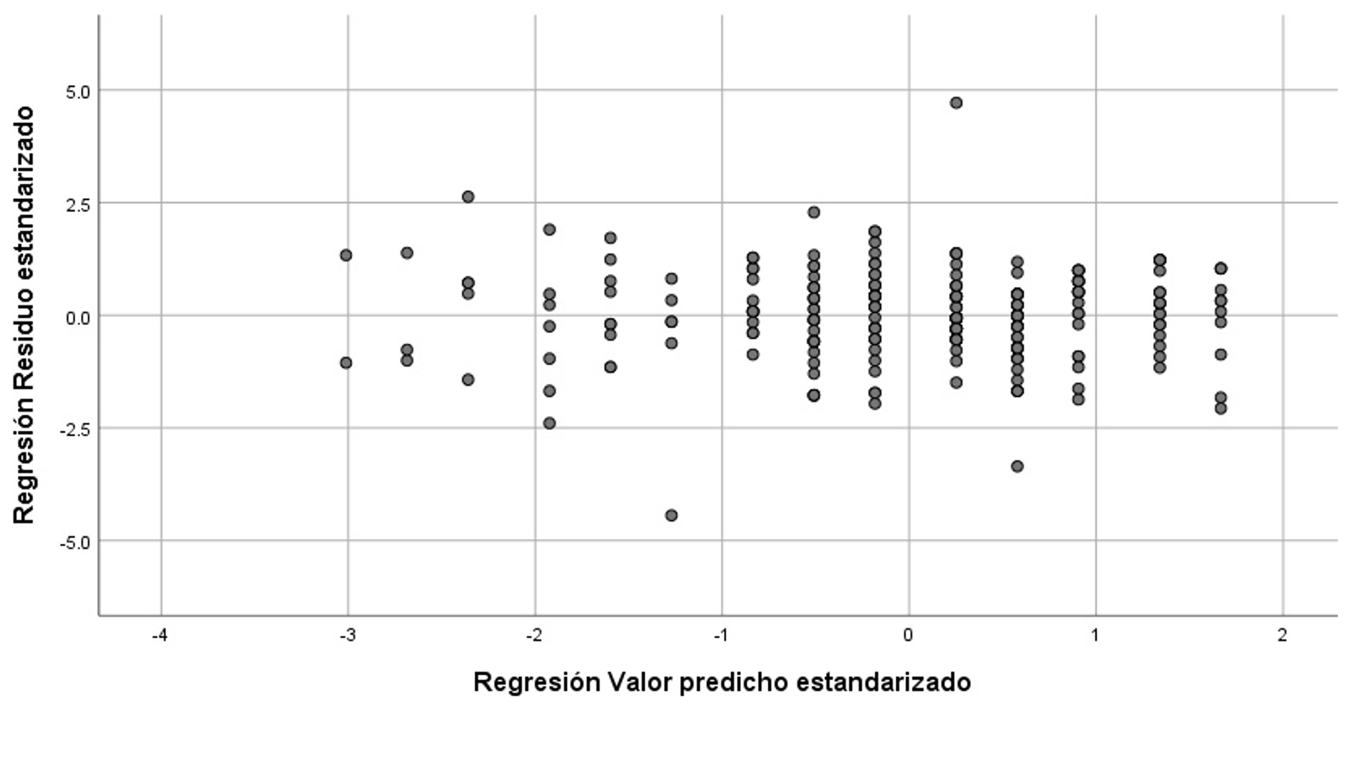 Finalmente, el siguiente diagrama que se muestra en la Figura 3, verifica el supuesto de homocedasticidad. Se puede observar una distribución de los datos a lo largo de la figura, es decir, no hay un cúmulo donde se concentre la mayoría de los datos. Por lo tanto, se acepta el supuesto de homocedasticidad.
