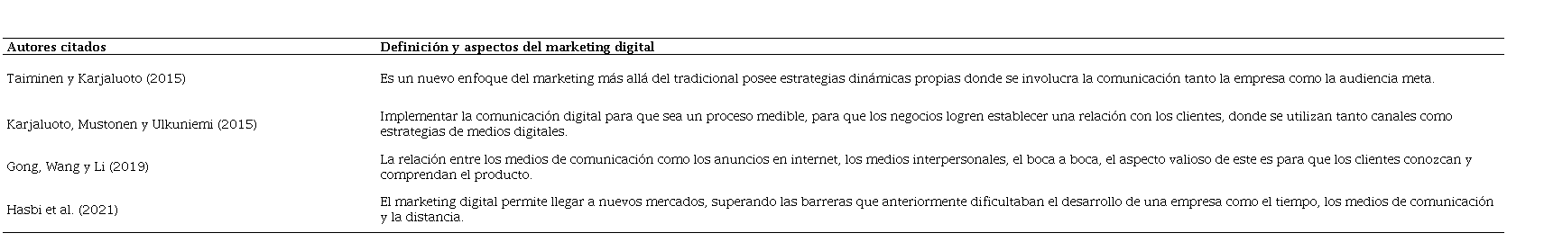 Por su parte, algunos problemas de las PYMES es que gran parte de ellas no tiene un sitio web o cuenta en las redes sociales digitales, lo que es fundamental para captar clientes meta y obtener retroalimentación (Rivera-Trigueros et al., 2019). En este sentido, el uso del internet, TIC y empleo de las distintas herramientas de forma correcta y constante, es esencial para mantener una buena relación con los clientes. Para ubicar en contexto al Marketing Digital, se presentan en la Tabla 2 distintos autores y sus perspectivas sobre el concepto.