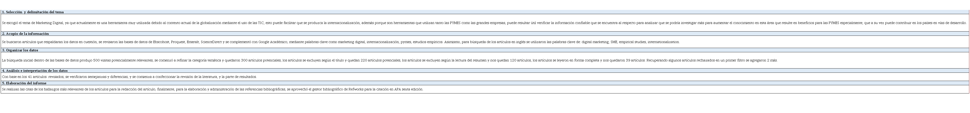 Methodology: Research documentary type, which consists of a scientific, systematic, and objective method of searching and collecting data, 41 articles related to Digital Marketing, SMEs, internationalization, obstacles, and alternatives to adopting an internationalization approach were reviewed.