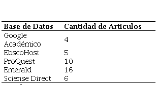 En este proceso de búsqueda de información se revisaron las bases de datos de Ebscohost, Proquest, Emeralt, ScienceDirect y se complementó con Google Académico. Se procesaron en total 42 artículos completos revisados por pares, de un total de 33 revistas dentro de las cuales se resaltan las 5 más importantes: International Marketing Review, Estudios Gerenciales, International Business Review, Management International, Management Research Review. En la Tabla 5 se expone la cantidad de artículos por base de datos obtenidos.