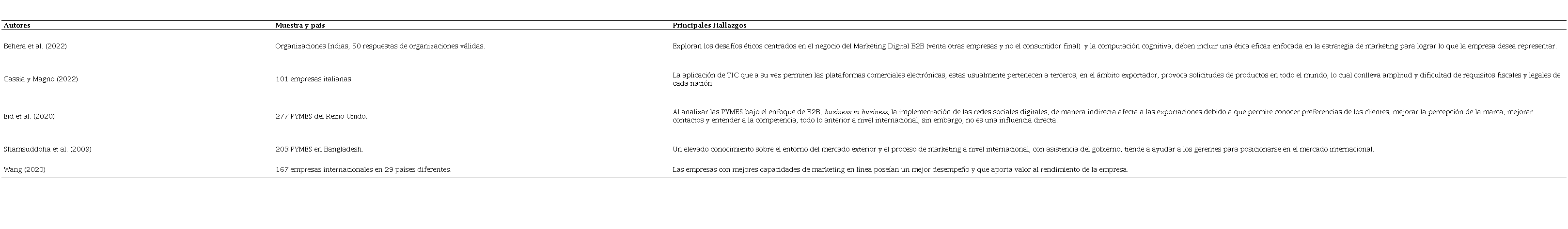 Las referencias de la Tabla 6 enriquecen el estudio del Marketing Digital, a través de importantes aportes en cuanto a la relación entre este y la internacionalización con evidencias empíricas. Los autores Behera et al. (2022) y Eid et al. (2020), coinciden en el estudio mediante el enfoque Business to Business (B2B). Por una parte, Behera et al. (2022) relaciona el Marketing Digital mediante la ética y, por otra, Eid et al. (2020) a través de las redes sociales y la exportación.