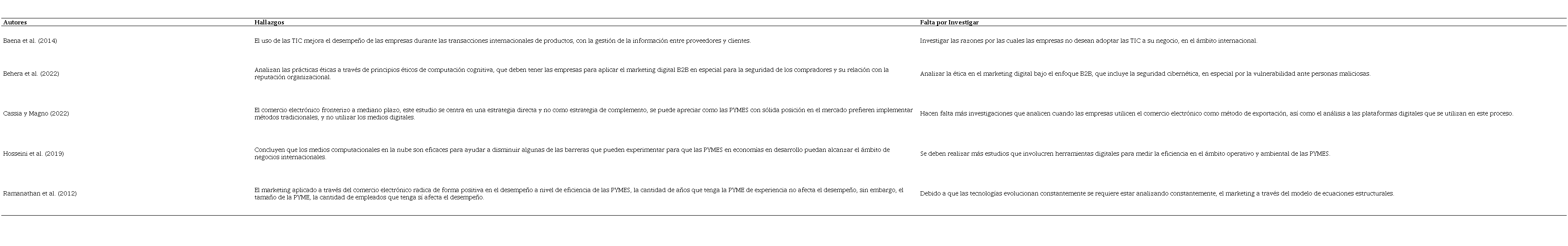 En la Tabla 7 se presentan investigaciones realizadas alrededor del uso del Marketing Digital e internacionalización, con sus principales hallazgos y lo que aún no se ha investigado.