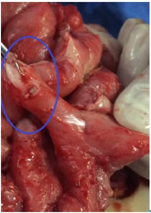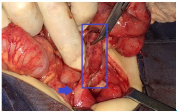 The first suspicion was intestinal obstruction, so a non-surgical medical treatment was initiated. However, the clinical symptoms of the patient were persistent with clinical signs of systemic inflammatory response, and physical examination showed deterioration of abdominal pain despite initial management; for this reason, the patient was referred to the pediatric surgery service for an emergency exploratory laparotomy due to acute abdomen. Performing an abdominal ultrasound or a tomography of the abdomen and pelvis was not possible because of the rapid deterioration of the patient.