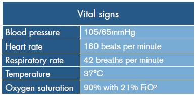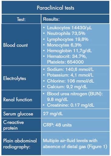 At the moment of the consultation, the mother reported symptoms of a day of evolution that began with increasingly diffuse abdominal pain, followed by abdominal distention, multiple episodes of vomiting of gastric contents, and febrile peaks quantified in 39°C, in that order. During physical examination, the patient was found in poor general condition, with grade II dehydration, signs of respiratory distress, alertness, weight of 9.4 kg and vital signs as described in Table 1. The positive findings were enophthalmos; nose with nelaton catheter in permeable right nostril; dry oral mucosa; tachycardia; tachypnea; distended globular abdomen with abolished intestinal noises and tympanic to percussion; voluntary muscular defense, and pain on palpation. Paraclinical tests were requested, yielding the results summarized in Table 2.