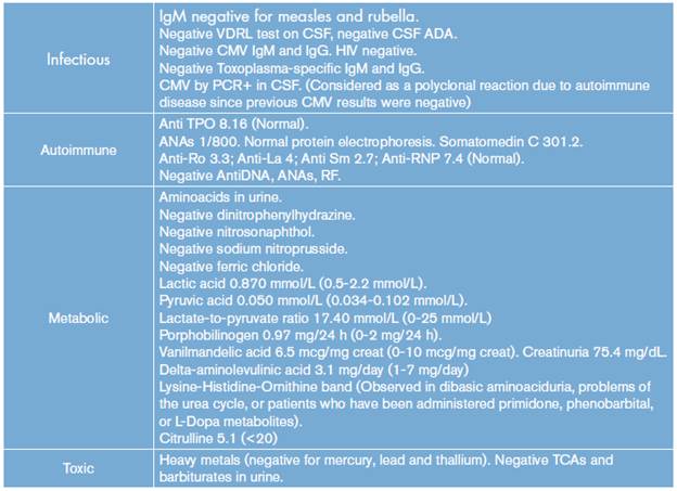 Possible infectious, inflammatory, metabolic, autoimmune and toxicological etiologies were discarded, while initial neuroimages did not show any alteration (Table 1).