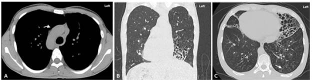 According to the classification proposed by Reid 15, bronchiectasis is divided into cystic, cylindrical and varicose. Its characterization, in the case of this patient, was carried out by means of a CT scan that showed a predominantly cystic pattern. According to another case report 16, the three types of bronchiectasis have been described in patients with KS in equal proportions.