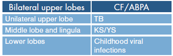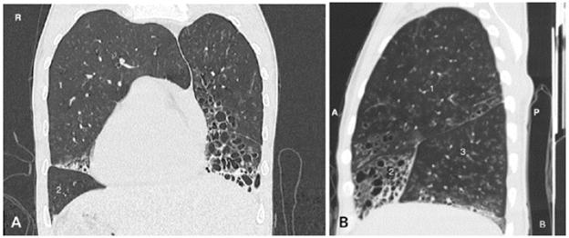 Imaging plays a key role in proving the anatomical findings that support KS. However, the diagnostic precision of PKD is achieved with the elements mentioned above, all of which are difficult to access. Inadequate sweeping of pulmonary secretions causes bronchial dilatations or bronchiectasis that are observed as tubular opacities or ovoids of variable sizes in chest x-ray, a less sensitive method for its detection with respect to HRCT. 12